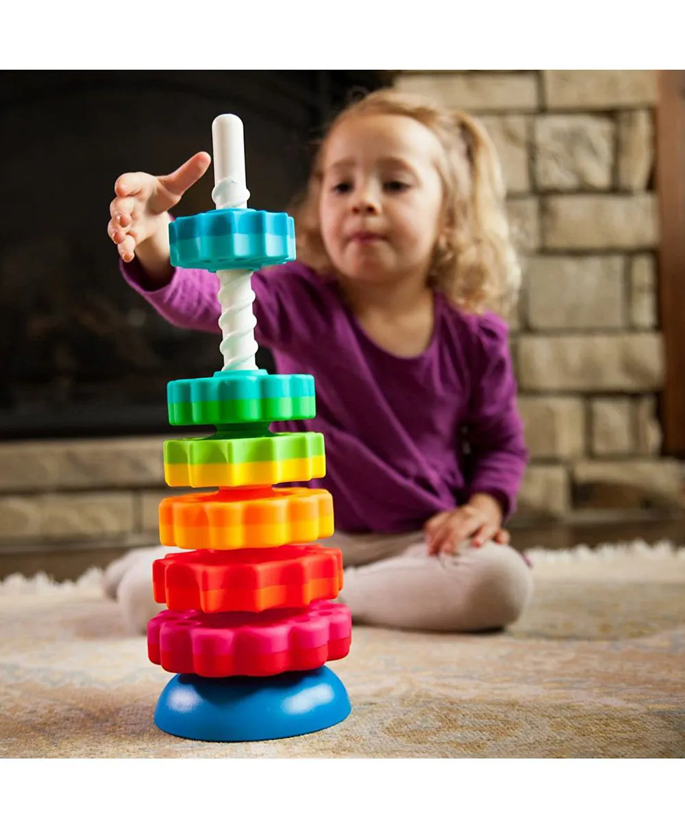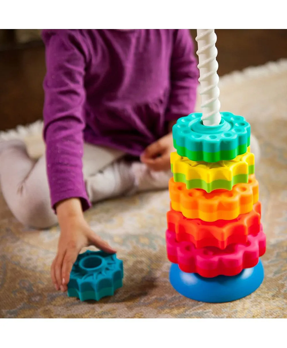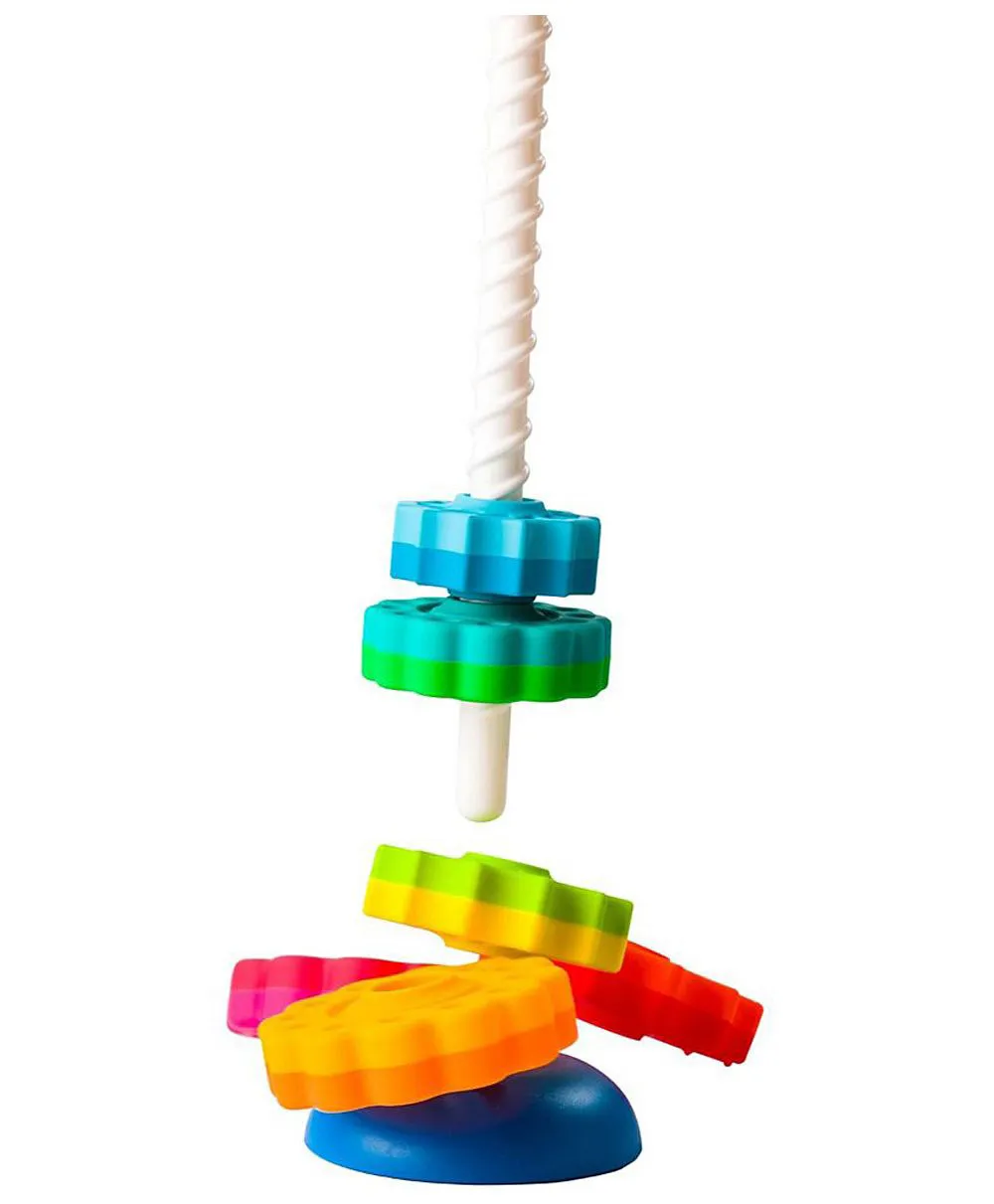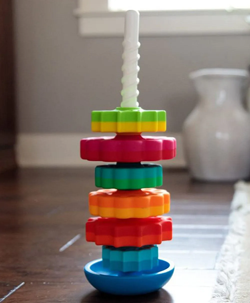 It’s a stacking toy with a spin – Literally! Drop the vibrant discs onto the threaded corkscrew pole and watch as they spin fast and smooth to settle onto the reversible wobble base. , , Each disc is dual-colored, shaped like either a daisy or a star, and sized from large to small, forming a dynamic rainbow featuring magenta, lime, teal, lemon, red, and blue. Spin them into any order you want – Then, pull the corkscrew pole from the base to watch them all tumble!